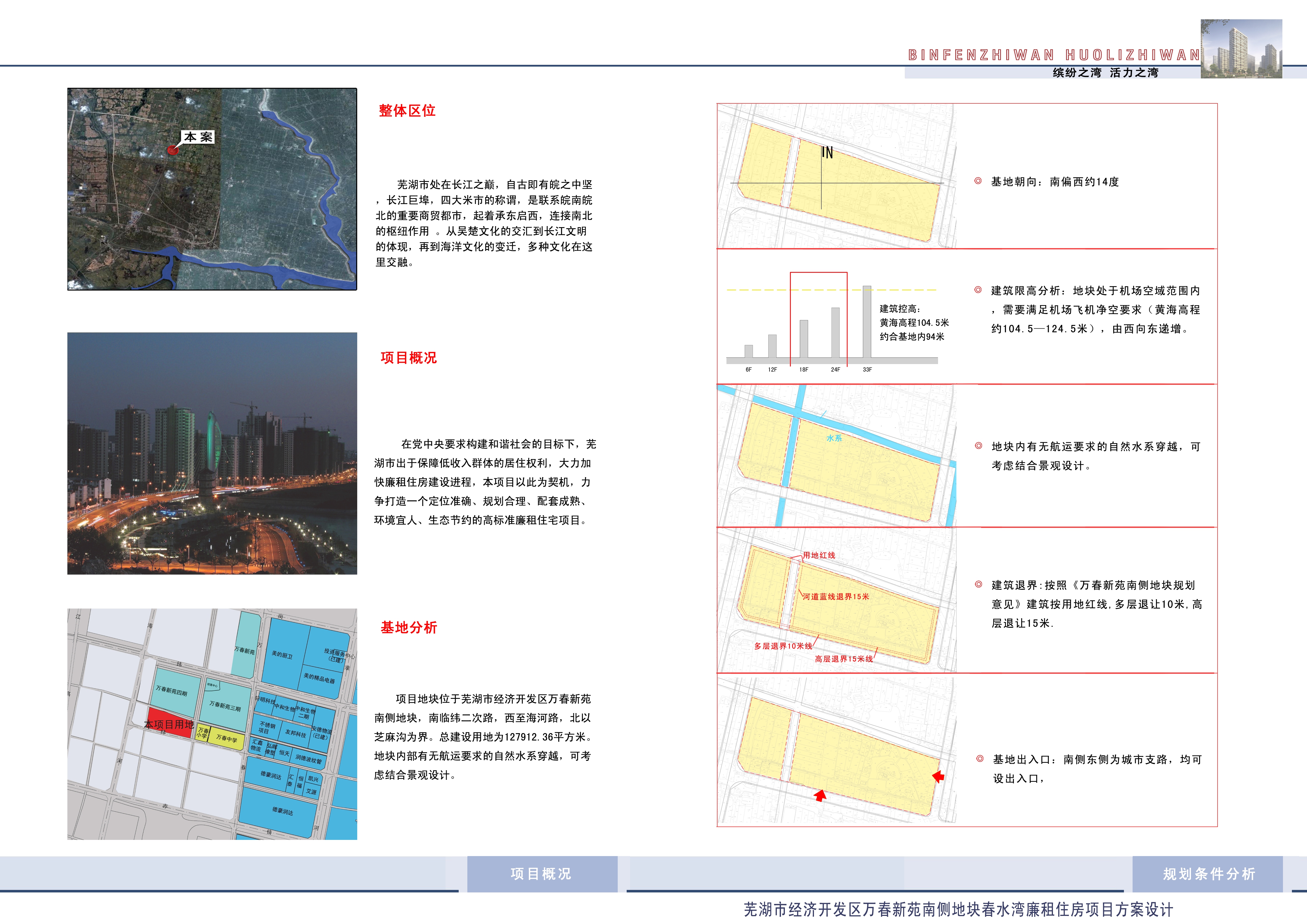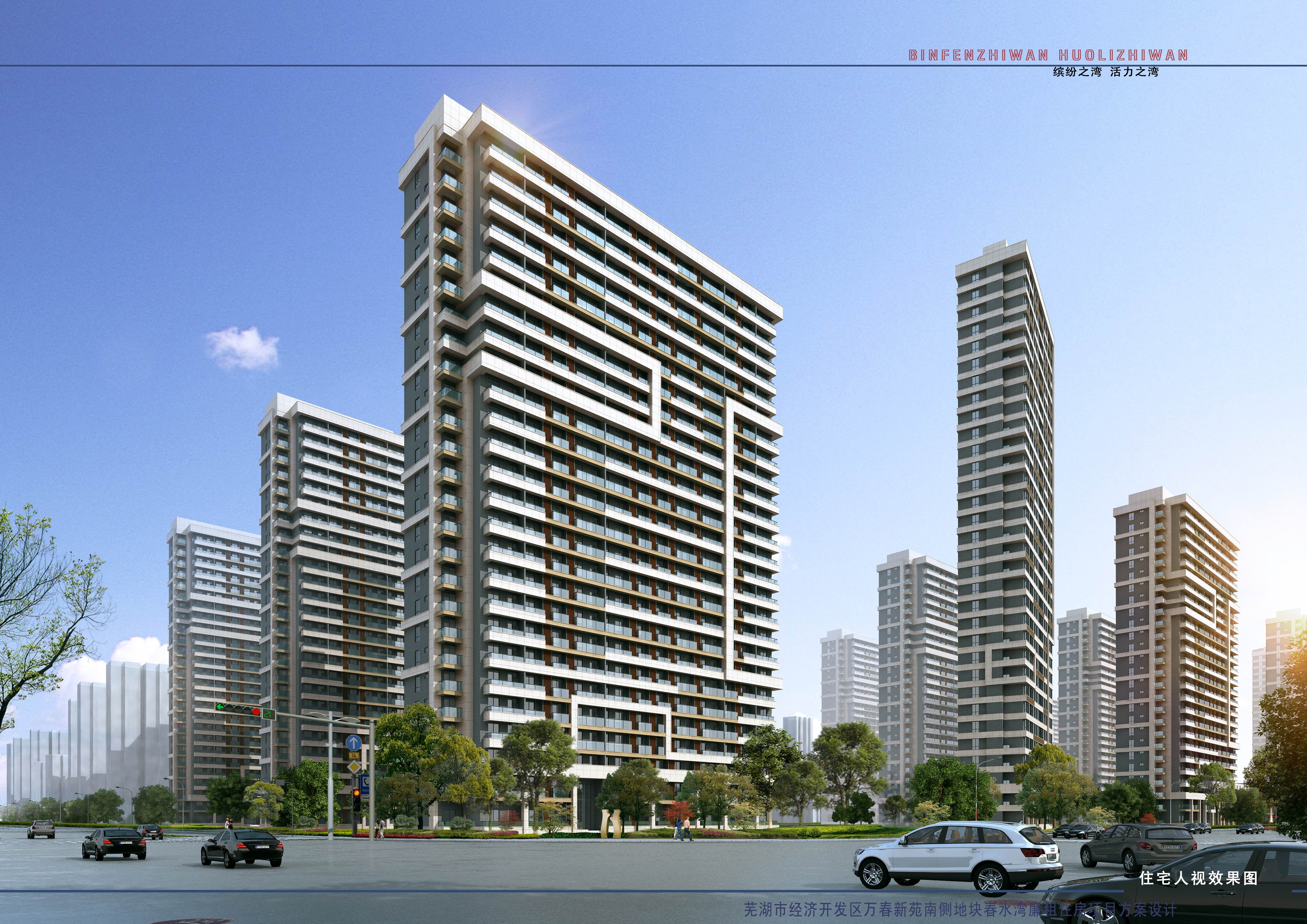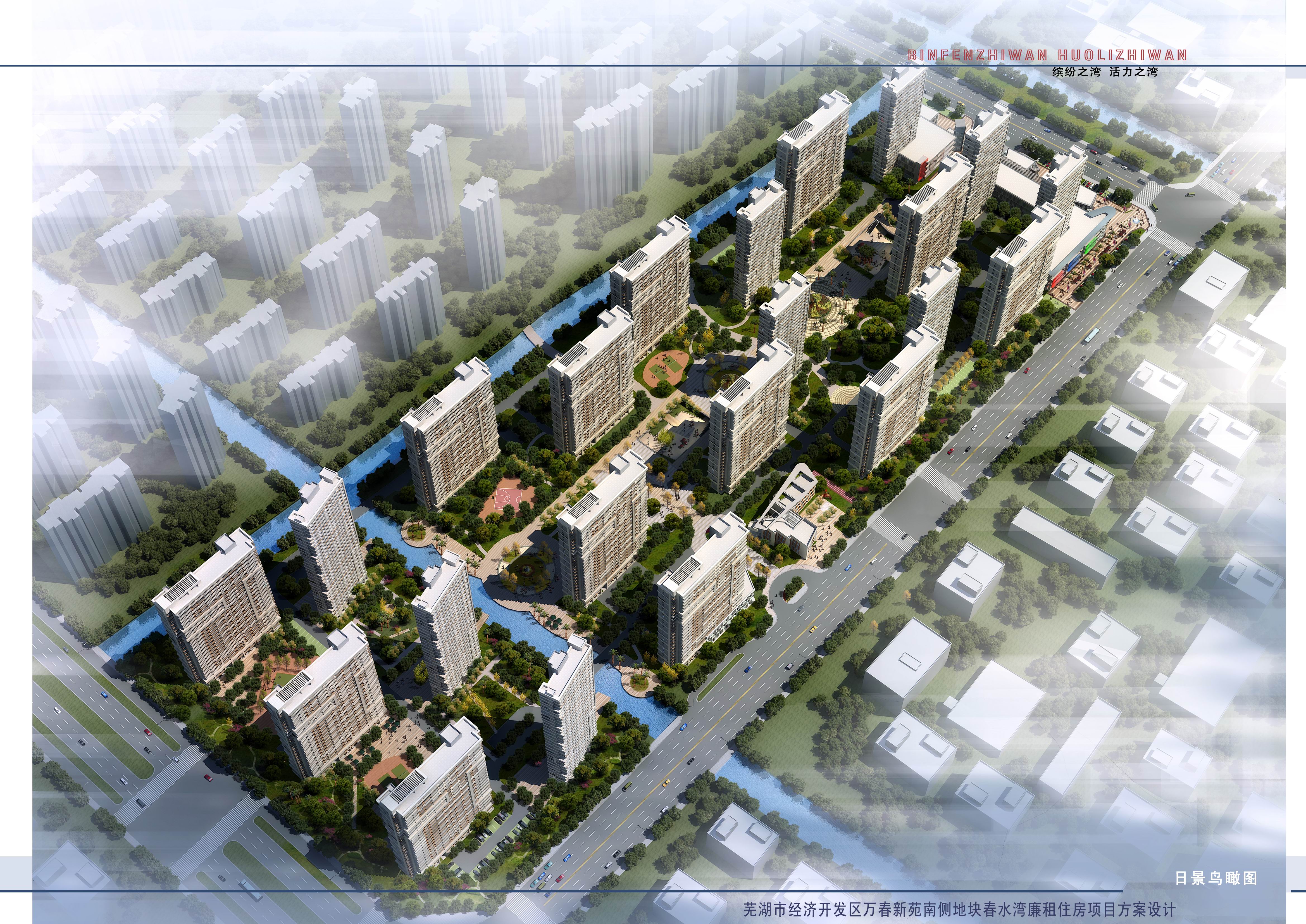 宜居春水灣位于蕪湖市經(jīng)濟(jì)開(kāi)發(fā)區(qū)東區(qū)萬(wàn)春新苑南側(cè)地塊,南臨緯二次路,西至夢(mèng)溪路,北以芝麻溝為界。占地約192畝,建筑密度17.7%,容積率2.49,綠地率40.8%。規(guī)劃總建筑面積約42.1萬(wàn)㎡, 其中計(jì)容建筑面積31.9萬(wàn)㎡(含住宅28.8萬(wàn)㎡,商業(yè)用房2.3萬(wàn)㎡,幼兒園0.3萬(wàn)㎡,其他配套用房0.5萬(wàn)㎡),不計(jì)容面積10.2萬(wàn)㎡,主要為地下機(jī)動(dòng)車(chē)、非機(jī)動(dòng)車(chē)庫(kù),人防地下室,景觀(guān)架空層等。該項(xiàng)目由22幢單體建筑組成,住宅6055套,機(jī)動(dòng)車(chē)停車(chē)位2550個(gè),非機(jī)動(dòng)車(chē)停車(chē)位13000個(gè)。